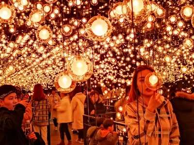 3月2日,游客在黑龙江省哈尔滨市中央大街“花涧追光”光影艺术展内感受光影魅力。