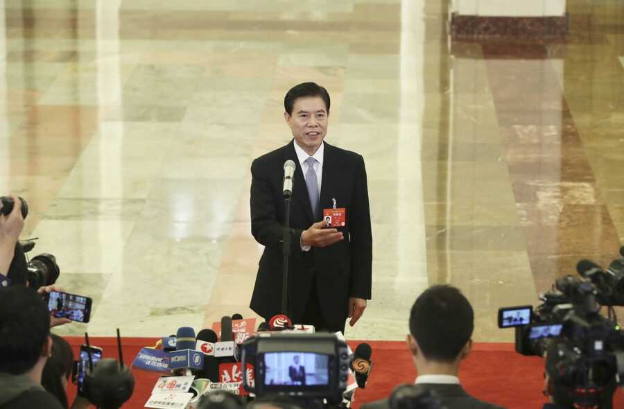 3月5日,第十三届全国人民代表大会第二次会议在北京人民大会堂开幕。这是商务部部长钟山在“部长通道”接受采访。新华社记者 殷刚 摄