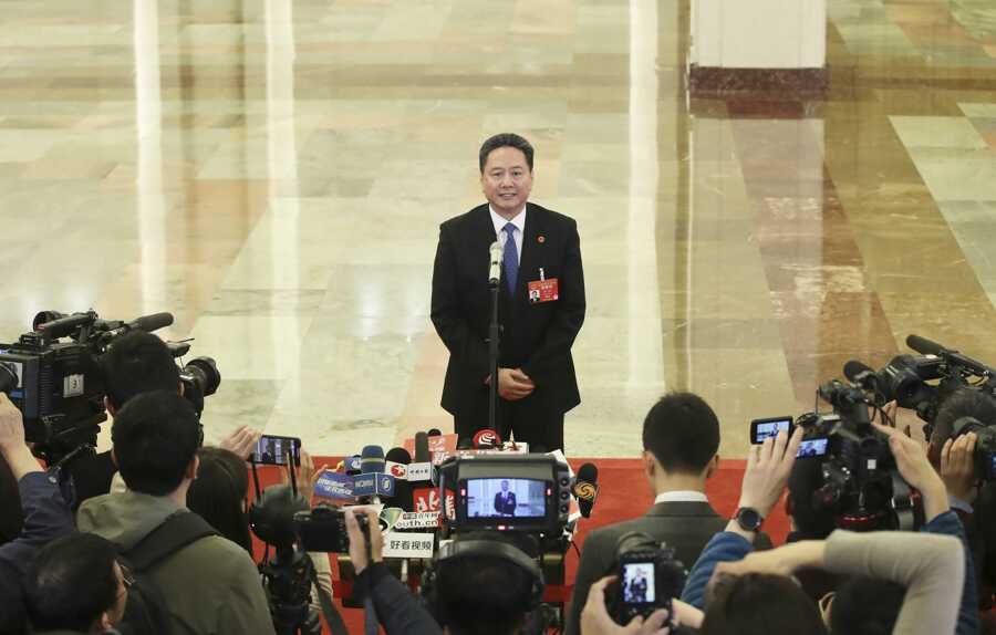3月5日,第十三届全国人民代表大会第二次会议在北京人民大会堂开幕。这是交通运输部部长李小鹏在“部长通道”接受采访。新华社记者 殷刚 摄