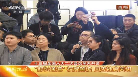 羊城晚报特派北京记者李钢手持话筒提问 央视报道截图