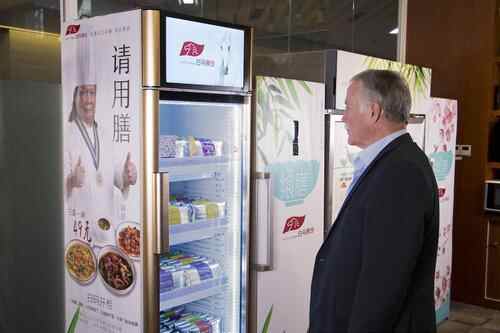 另一位来自广州偕作信息科技有限公司的创始人李晓莅则推介了他们研发的智能售货柜,该售货柜引入人脸识别、细粒度物品识别等AI技术,消费者只需要用手机扫码打开柜门,从里面拿走任意货品手机都能马上识别出来然后自动完成扣费,非常智能化。