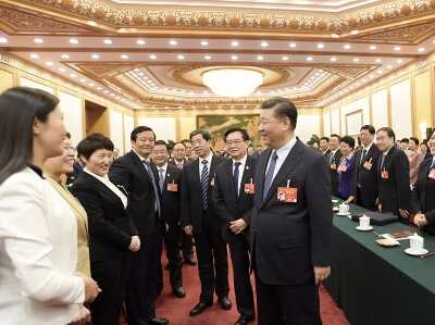 3月8日,中共中央总书记、国家主席、中央军委主席习近平参加十三届全国人大二次会议河南代表团的审议。在“三八”国际劳动妇女节到来之际,习近平代表党中央,向参加全国两会的女代表、女委员、女工作人员,向全国各族各界妇女,致以节日的祝贺和美好的祝福。这是习近平同女代表亲切交谈。新华社记者 李学仁 摄