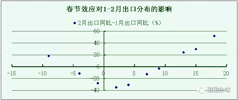 纵轴表示的是2月份出口同比增长情况与1月份的差值——差值越大,越说明2月份出口增长情况好于1月份。)
