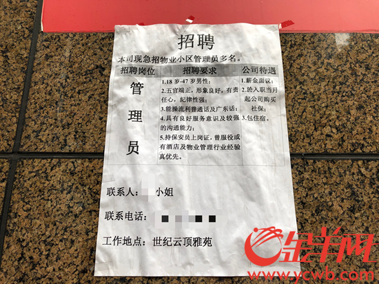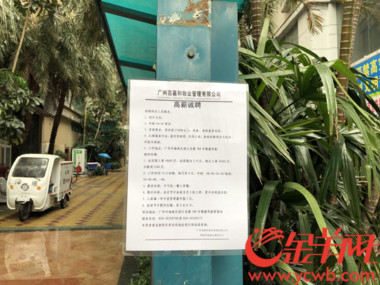记者走访发现,不单是王女士所居住的小区,其周边多个小区,如锦骏华庭、金豪嘉苑、世纪云顶雅苑都纷纷贴出了招聘告示。而在某招聘网站上,近3日广州已有2162条保安职位需求被发布,相同时间内,我们熟知的紧缺工种——月嫂的招聘需求只有107条。