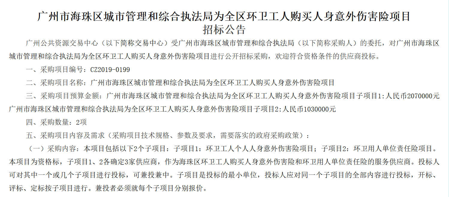 11日,记者从广州公共资源交易中心了解到,日前广州市海珠区城市管理和综合执法局为全区环卫工人购买人身意外伤害险项目进行公开招标采购。