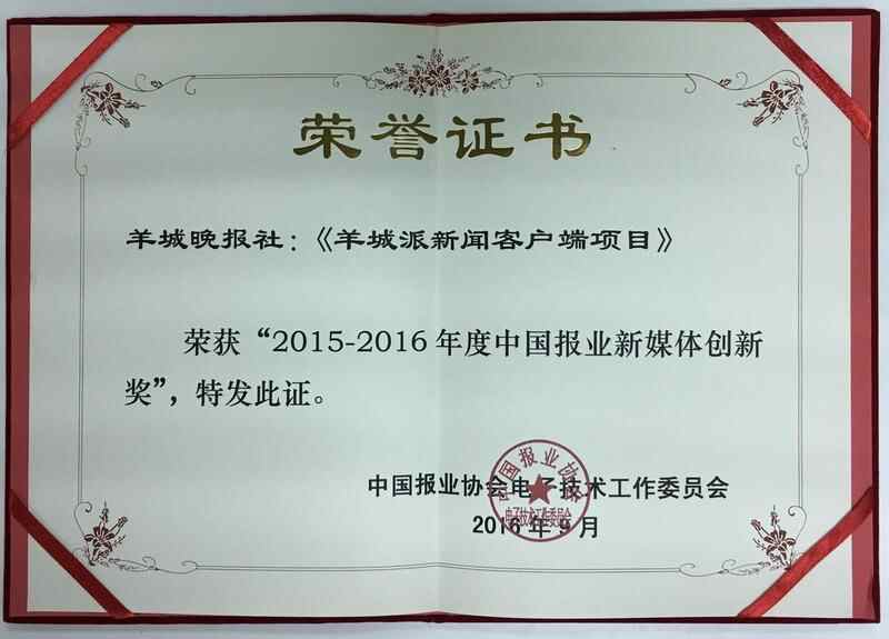 获中国报业协会电子技术工作委员会颁发的“2015-2016年度中国报业新媒体创新奖”。