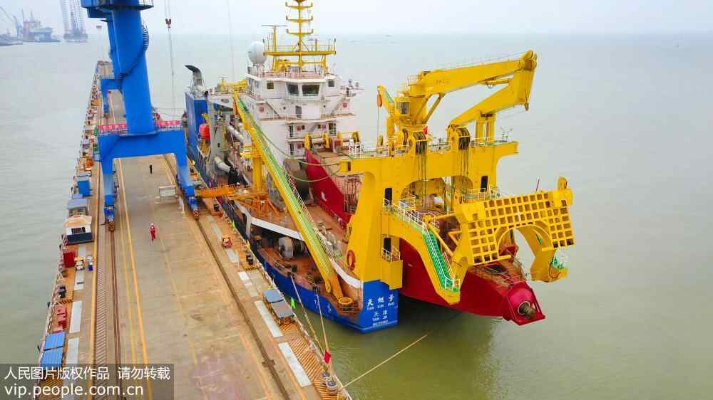 在江苏启东拍摄的由中国完全自主设计的亚洲最大、最先进的绞吸挖泥船“天鲲号”。(资料图)