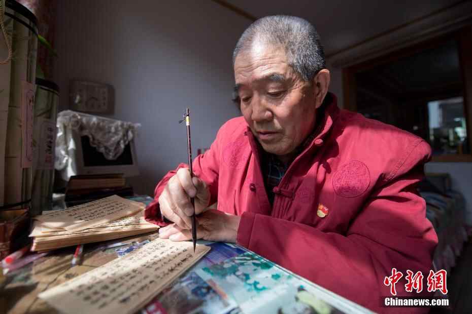 楷体小字367万个,手抄书152本,手工装帧后按顺序整齐放在箱子里,箱子堆起来,占了张喜才卧室的四分之一。这些被他视为“镇宅之宝”的《红楼梦》《水浒传》《西游记》《三国演义》四大名著手抄本,是其耗时八年完成的作品。年过七旬的张喜才是山西省高平市丝织印染厂的退休职工,因家境贫困,他只上到小学四年级,但自小受长辈影响,酷爱写字,尤其喜爱毛笔字,一有时间就临摹名家书法,细细揣摩,慢慢钻研,无师自通。2018年4月23日,抄完四大名著后,张喜才接着抄写了《道德经》《千字文》等,他还将写好的《曾国藩家训》《朱子治家格言》等贴在空白卷轴上,全部展开长达25米。图为3月13日,山西省高平市,张喜才老人在家中写字。 中新社记者 韦亮 摄