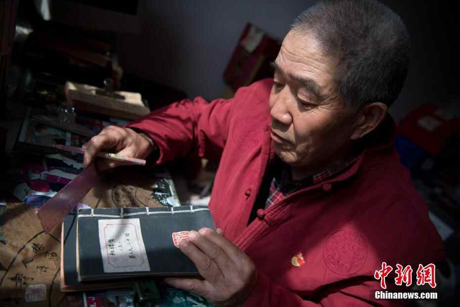 楷体小字367万个,手抄书152本,手工装帧后按顺序整齐放在箱子里,箱子堆起来,占了张喜才卧室的四分之一。这些被他视为“镇宅之宝”的《红楼梦》《水浒传》《西游记》《三国演义》四大名著手抄本,是其耗时八年完成的作品。年过七旬的张喜才是山西省高平市丝织印染厂的退休职工,因家境贫困,他只上到小学四年级,但自小受长辈影响,酷爱写字,尤其喜爱毛笔字,一有时间就临摹名家书法,细细揣摩,慢慢钻研,无师自通。2018年4月23日,抄完四大名著后,张喜才接着抄写了《道德经》《千字文》等,他还将写好的《曾国藩家训》《朱子治家格言》等贴在空白卷轴上,全部展开长达25米。图为3月13日,山西省高平市,张喜才老人在家中整理他手抄的小楷体四大名著。 中新社记者 韦亮 摄