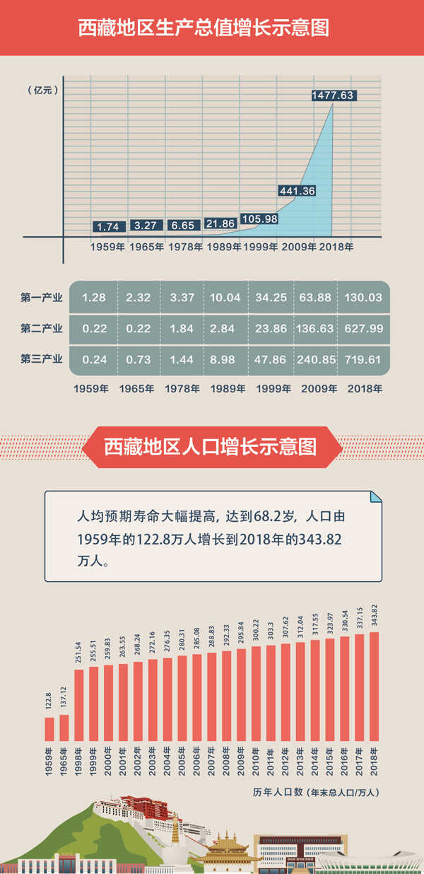 短短几十年跨越上千年。西藏民主改革60年来,全区各项事业取得辉煌成就,谱写了革命、建设、改革的壮美篇章。图为民主改革以来西藏地区生产总值和人口增长示意图。 数据来源:西藏自治区统计局 孙彤/制图
