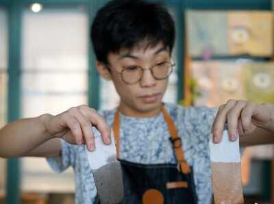 染乐工房已经摸索出一套行之有效的提炼天然色彩的方法。图为创始人张骏霖使用白色布条测试染料的颜色是否符合需求。中新社记者 张炜 摄