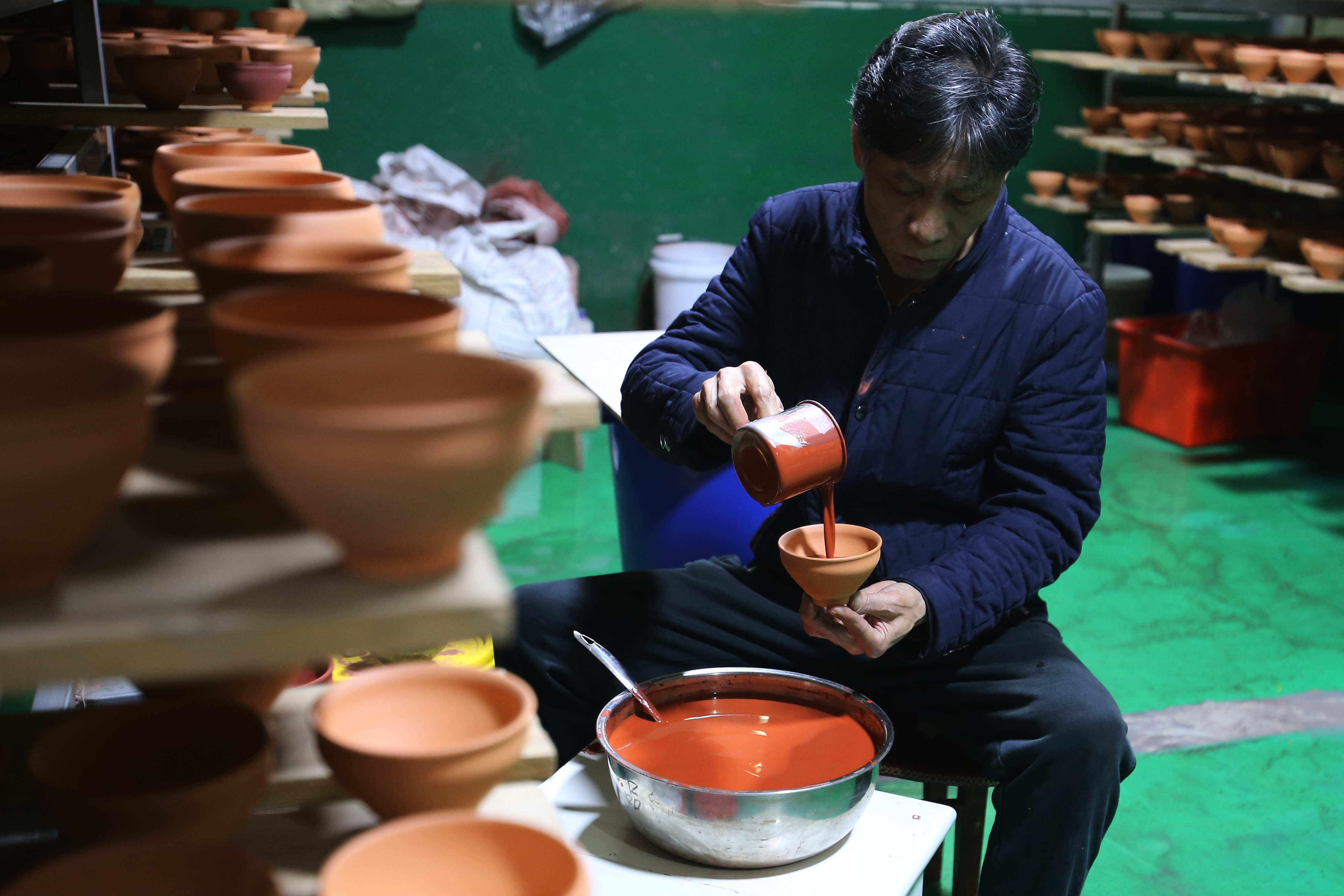 ↑3月28日,吴立主在准备为建盏坯上釉。新华社记者安希雅摄