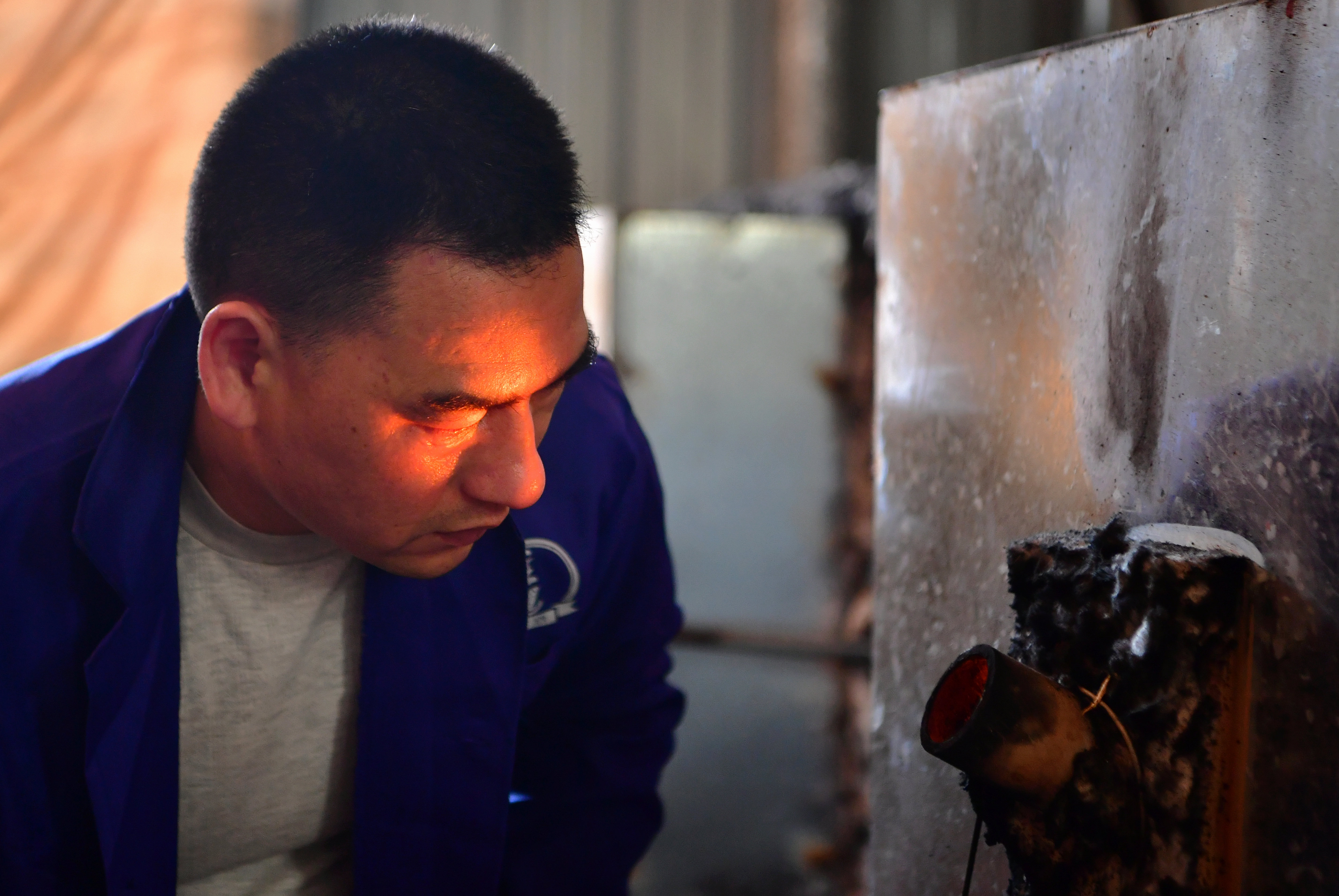 ↑3月28日,吴周福在查看他正在烧制的建盏。新华社记者魏培全摄