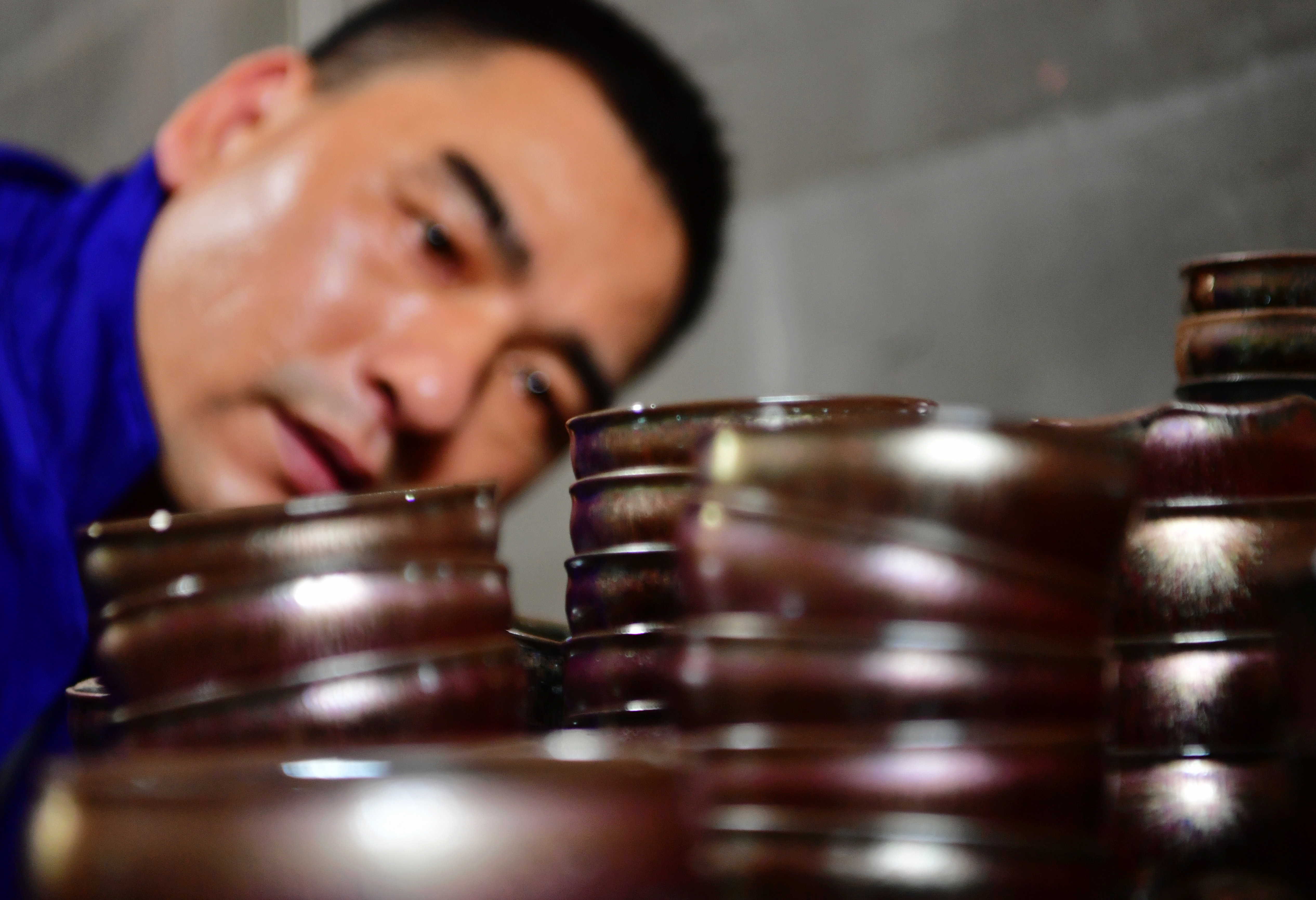 ↑3月28日,吴周福在精心挑选他烧制的建盏作品。新华社记者魏培全摄