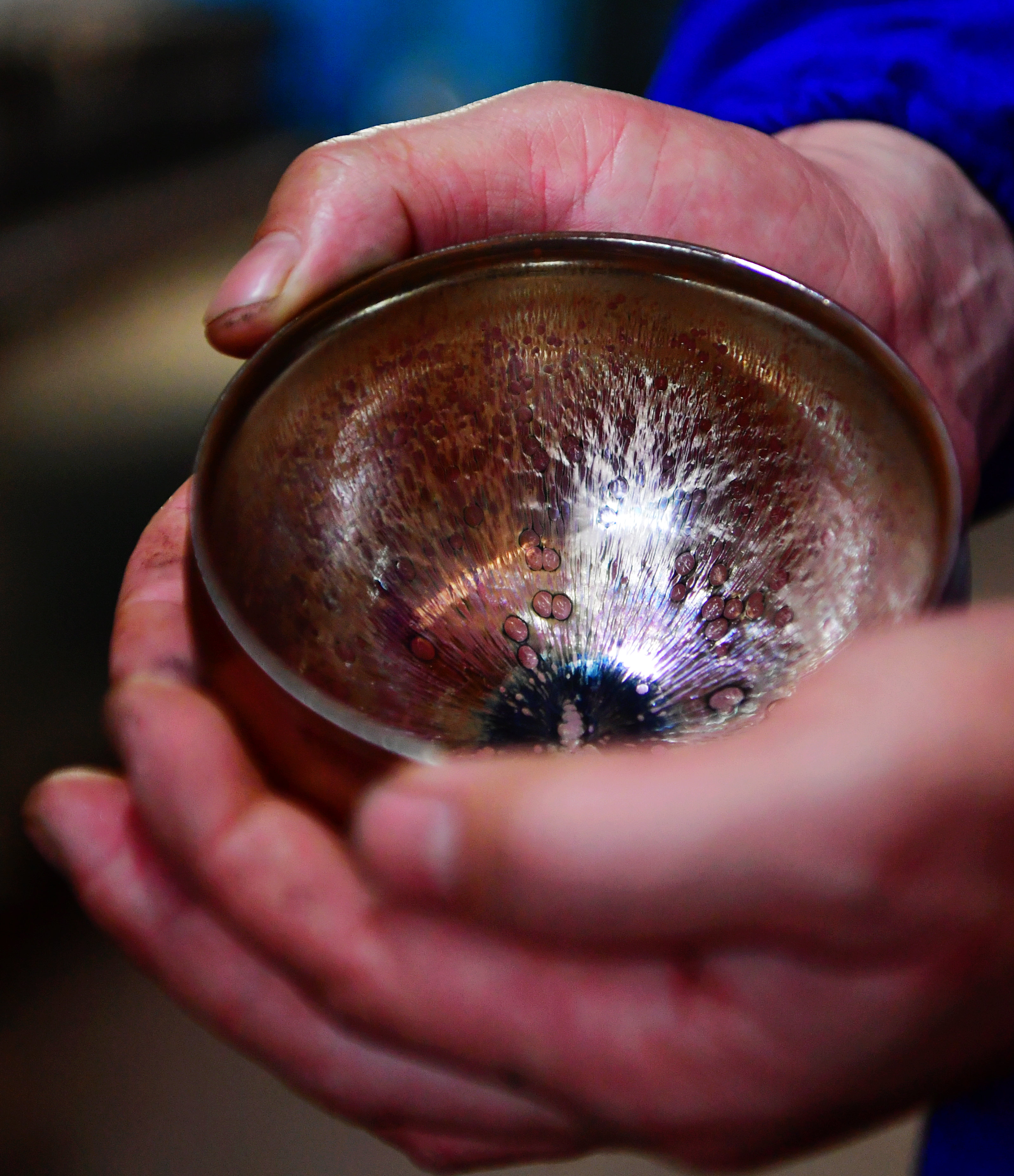 ↑3月28日,这是吴立主展示刚从电炉中取出的曜变建盏。新华社记者魏培全摄
