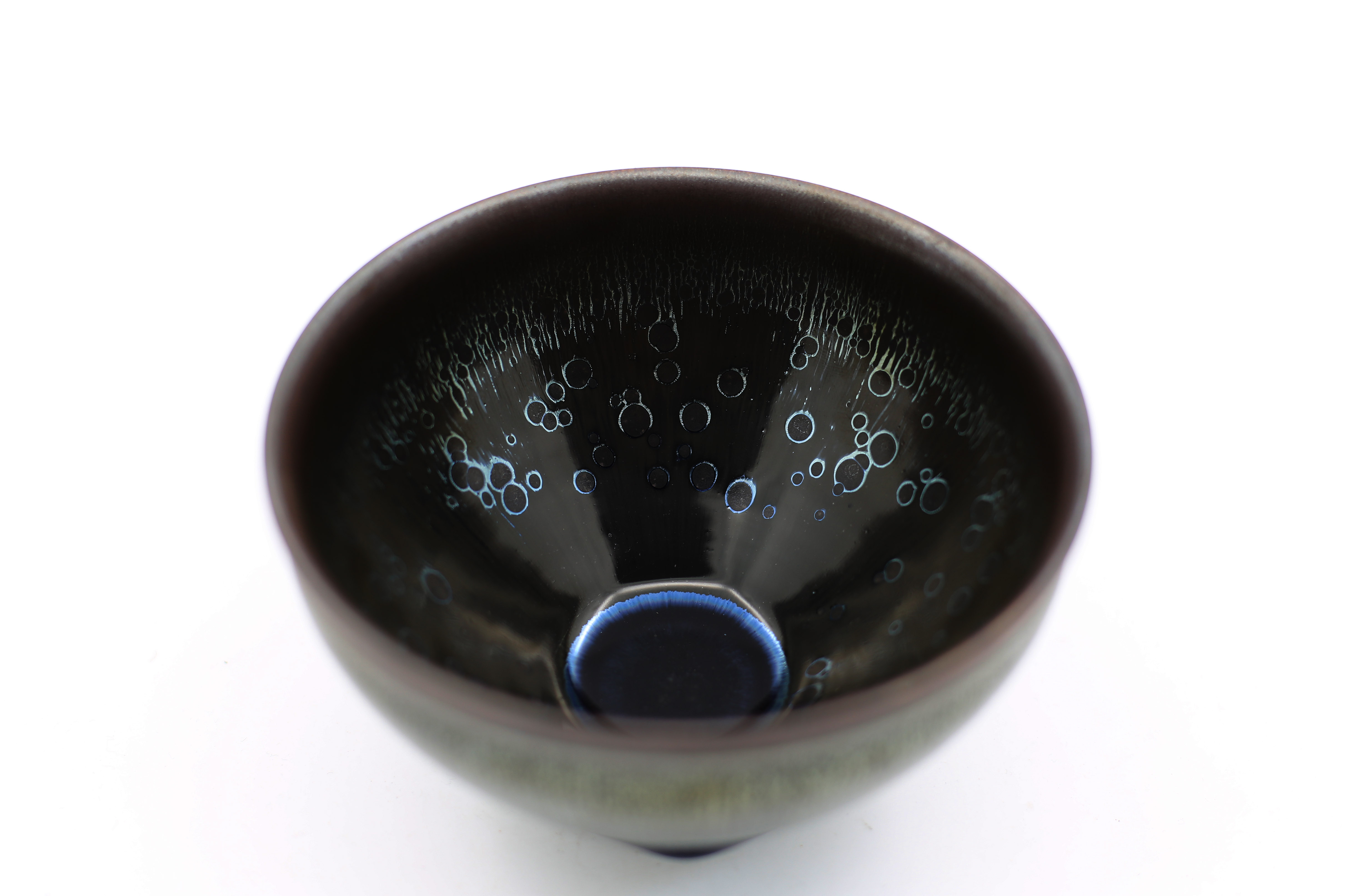 曜变是指在建盏烧制过程中,器物表面形成一种非常薄的铁结晶膜,在光照之下,薄膜上焕发出黄、蓝、绿、紫等颜色的彩光。曜变建盏的烧制技艺早已失传700余年。曜变建盏烧制之难,激励着建盏故乡——南平市建阳区的许多工艺师以毕生精力复原破解。吴立主是建盏界老一辈工艺师。2015年,吴立主偶然间试制出两款斑纹神似龙鳞和曜变的建盏。自此,他一直执着探索,潜心烧制复原曜变建盏。“在我有生之年,一定要烧出一件让自己满意、市场认可的曜变建盏。”他说。