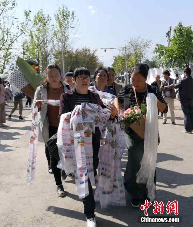 4月2日,四川西昌,民众手捧哈达前往殡仪馆悼念牺牲的扑火人员。四川省凉山州木里县雅砻江镇立尔村3月30日发生森林火灾。3月31日下午,四川森林消防总队凉山州支队指战员和地方扑火队员在扑火行动中,受风力风向突变影响,突发林火爆燃,27名森林消防队员和3名地方干部民众牺牲。部分牺牲人员遗体于4月2日送抵西昌市殡仪馆。中新社发 罗加山 摄