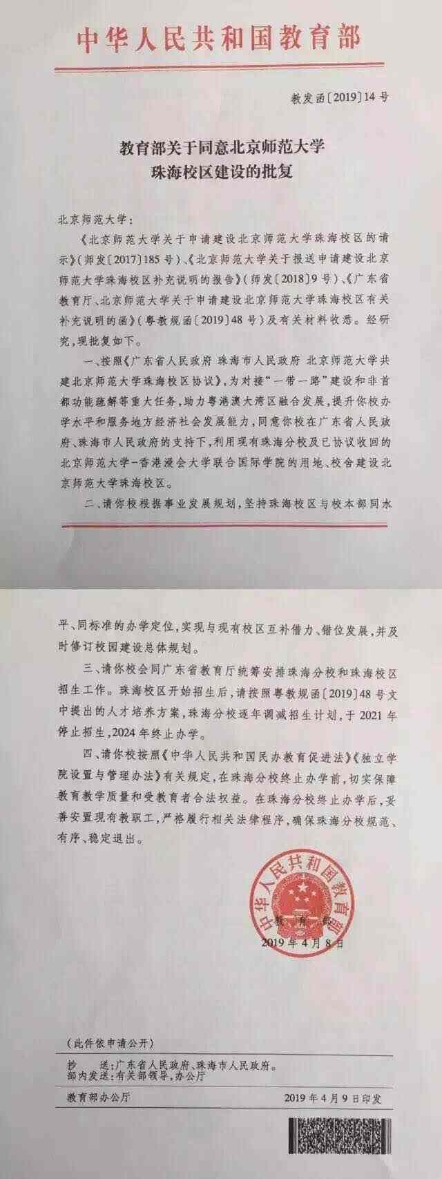 近日,一张《教育部关于同意北京师范大学珠海校区建设的批复》文件照片在朋友圈刷屏。4月11日,北京师范大学也同时“官宣”了这一消息称:“4月8日,教育部正式批复同意北京师范大学珠海校区建设。”