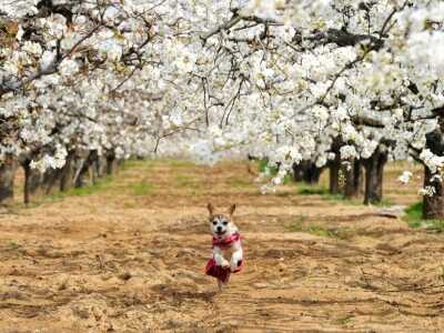 ↑4月11日,山东青岛西海岸新区石梁刘村,一只宠物狗在梨花盛开的酥梨园中玩耍。CICPHOTO/俞方平 摄