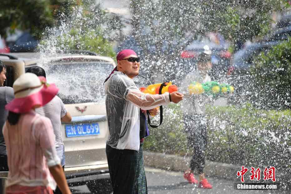 4月13日,民众在街头打水仗。当日,在云南省德宏傣族景颇族自治州瑞丽市,泼水节欢乐依然在持续,民众相约走上街头泼水狂欢。中新社记者 刘冉阳 摄
