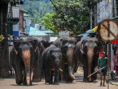 4月11日,在斯里兰卡平纳维拉,洗完澡的大象排队从街道上穿过,返回不远处的大象孤儿院。(新华社记者 郭磊 摄)