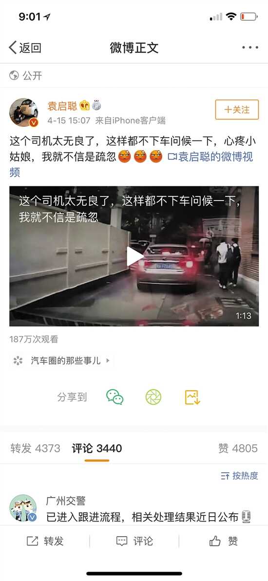 4月15日,微博认证为资深车评人的微博网友“袁启聪”发布视频微博,并配文“这个司机太无良了,这样都不下车问候一下,心疼小姑娘,我就不信是疏忽”。