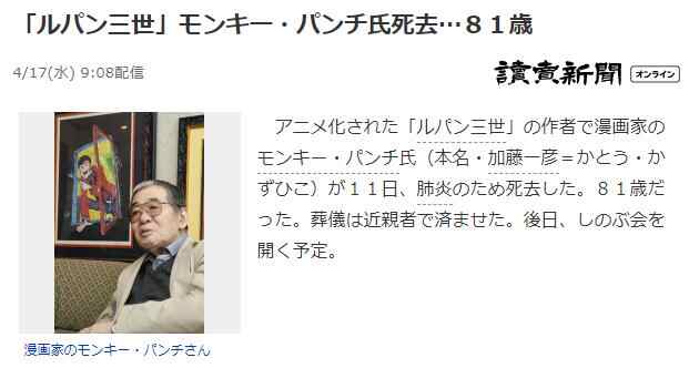 【环球网报道 记者 崔天也】日媒最新消息称,日本著名动漫《鲁邦三世》的漫画原作者Monkey Punch(本名加藤一彦)11日因肺炎去世,终年81岁。