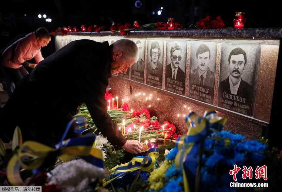 当地时间4月26日,乌克兰Slavutich民众凌晨前往墓地,点烛献花悼念在清理核事故死亡的“清理人”(liquidators)。