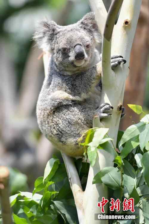 4月29日,广州第一代考拉“Uki”坐在树上休息。考拉“Uki”于2006年从澳大利亚来到广州长隆野生动物世界,在2019年3月度过了自己17岁的生日。据饲养员介绍,考拉平均寿命为10-12岁,17岁的“Uki”相当于人类超百岁高龄的老奶奶。中新社记者 陈骥旻 摄