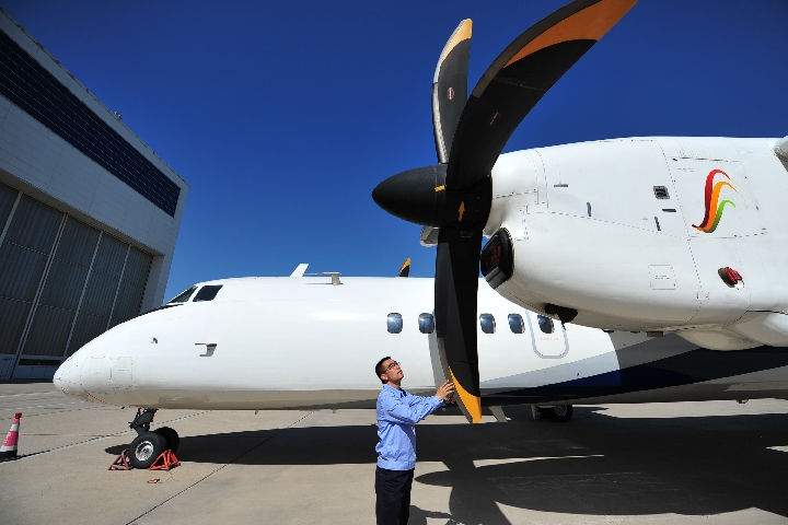 西飞民机集成交付中心工作人员杨旸在检查一架待交付的新舟60飞机的螺旋桨。新华社记者邵瑞 摄