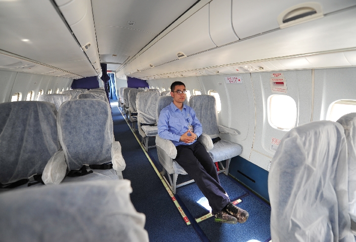 西飞民机集成交付中心工作人员杨旸坐在一架经过增大座椅排距改装的新舟60飞机内。新华社记者邵瑞 摄