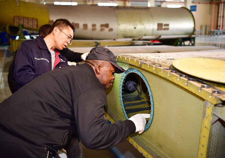 在西飞民机客户服务中心维修实习车间内,一名安哥拉学员在查看飞机机翼的内部结构。新华社记者邵瑞 摄