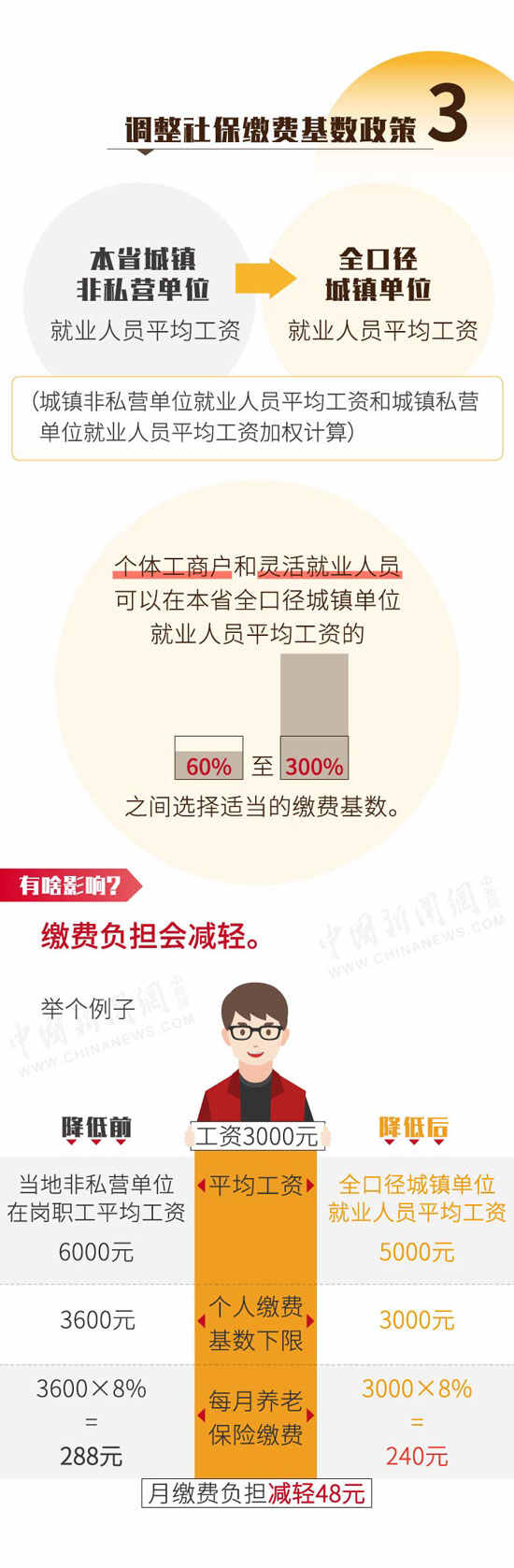 降费基方面,各省应以本省城镇非私营单位就业人员平均工资和城镇私营单位就业人员平均工资加权计算的全口径城镇单位就业人员平均工资,核定社保个人缴费基数上下限,合理降低部分参保人员和企业的社保缴费基数。