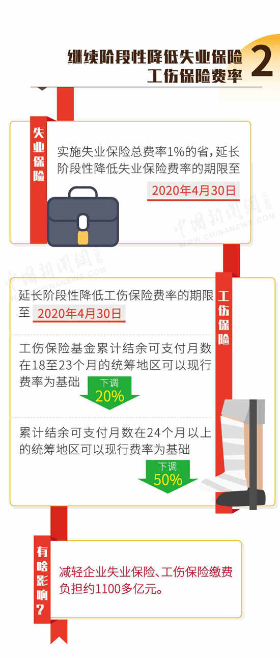 降费率方面,一是降低城镇职工基本养老保险单位缴费比例,高于16%的省份,可降至16%。二是继续阶段性降低失业保险和工伤保险费率,现行的阶段性降费率政策到期后再延长一年至2020年4月30日。