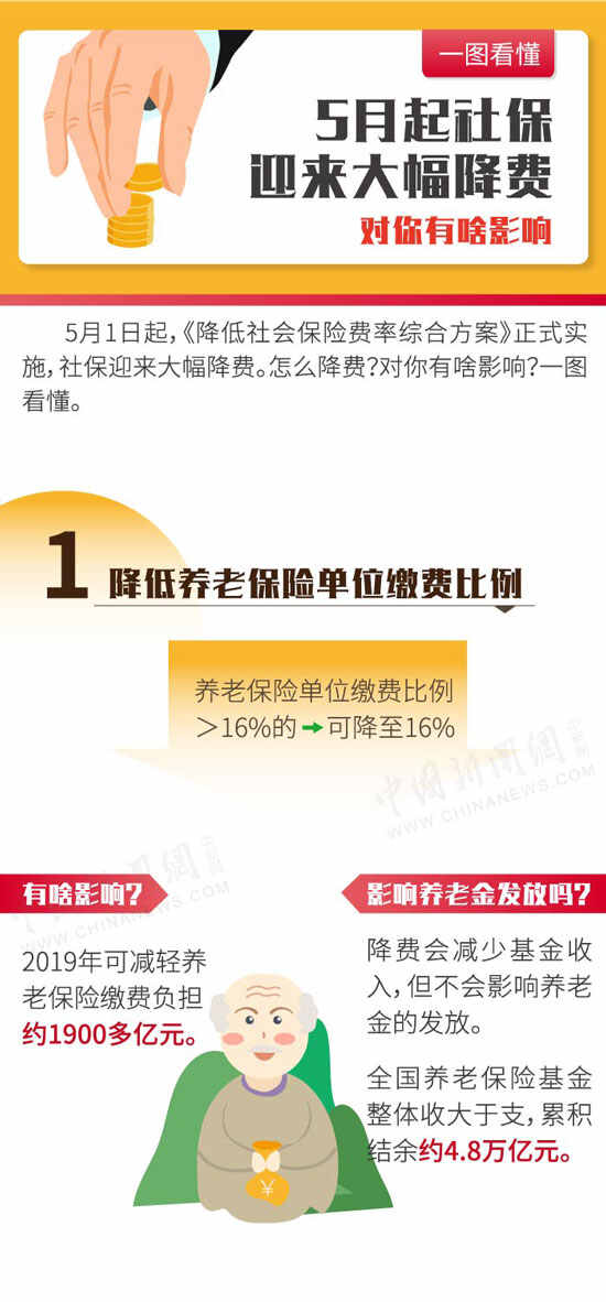 中新网客户端北京5月1日电(记者 李金磊)5月1日起,社保降费新政正式落地。此次社保降费能降多少?对企业和职工有啥影响?是否影响养老金发放?今年社保还有哪些大变化?一起来看。