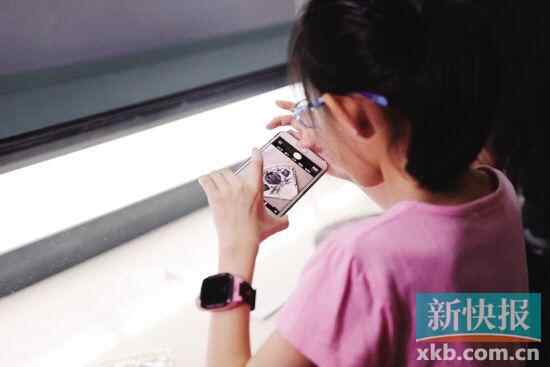 ■一个小朋友边看展览边用手机拍照。