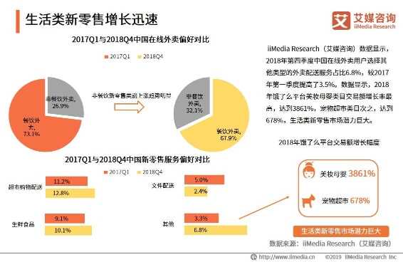 艾媒数据显示:2018年饿了么的美妆母婴板块同比增长3861%,宠物超市增长678%;三四线城市的鲜花、医药类外卖增幅明显,订单量和商户数分别增长74%、89%,以及1732%和876%。