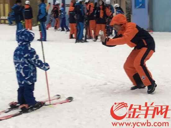 教练对神探进行了入门培训,两板与肩同宽,上体与膝盖微往前倾,双手握住雪杖自然下垂,眼睛目视前方,两腿均衡用力,保持平行下滑。