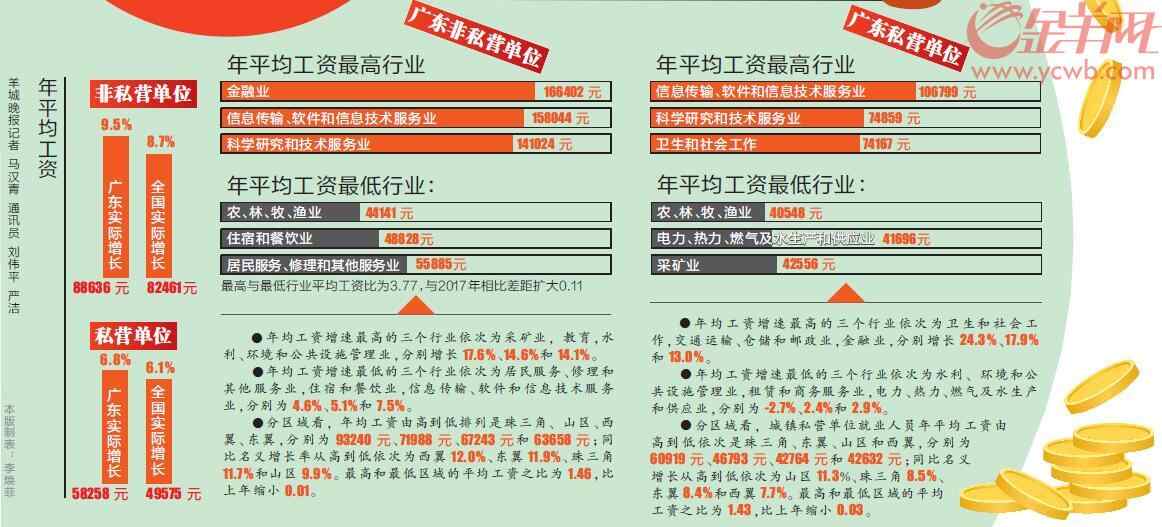 28日,广东省统计局发布了2018年广东城镇单位就业人员年平均工资情况。其中,非私营单位就业人员年平均工资88636元,同比名义增长11.9%,扣除物价因素实际增长9.5%;私营单位就业人员年平均工资为58258元,同比名义增长9.2%,扣除物价因素实际增长6.8%。