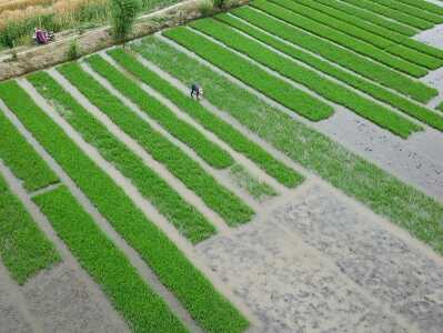 2019年6月1日,连云港市朝阳街道西庄村,村民在水稻秧田里劳作。随着芒种节气将至,江苏连云港市各地农民加紧对水稻秧苗进行田间管理,为即将到来的全面插秧做好准备。耿玉和/人民图片