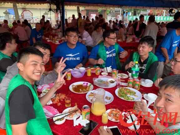 当天中午,珠村在村中祠堂、七夕广场摆下160多桌“龙船饭”,宴请兄弟村、老表村的亲人朋友们。每桌都有“鸿运烧肉”、“龙船丁”、“发菜伴蚝豉”等11个菜式。客人吃不完饭菜还欢迎打包走,村民说这是寓意“把龙船的喜气带给更多人”。