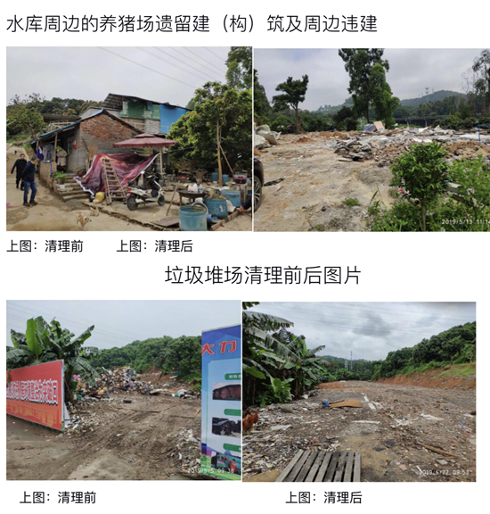 4月15日,属地南沙街对深湾水库上游黑臭鱼塘的三名塘主发出限期整改通知书,责令其立即停止喂食,封闭出水口,清理塘内养殖鱼。4月22日,南沙区相关部门组织三名当事人召开座谈会,对其说明养殖埃及塘鲺污染环境的严重性,以及污染环境的相关法律责任,并要求塘主加快推进自行清鱼工作。5月16日,三名塘主已按照要求,分别完成对5个黑臭养殖鱼塘的清鱼工作。目前,南沙区农业农村局对鱼塘污水进行净化处理中,待污水净化处理完毕后,将由属地南沙街对鱼塘进行填埋复绿。此外,该处原有2家废品回收公司已关停搬迁,水库周边养猪场遗留建(构)筑及周边违建已清拆,并完成水库周边垃圾堆场的清理工作。