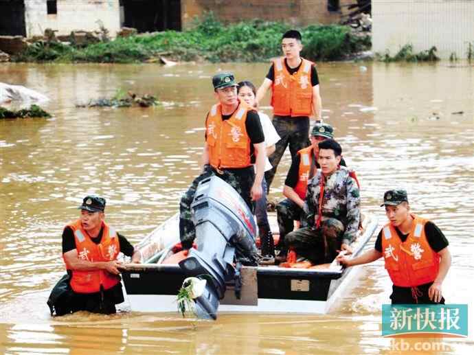 ■武警河源支队官兵在河源连平县上坪镇转移被困群众。新华社发
