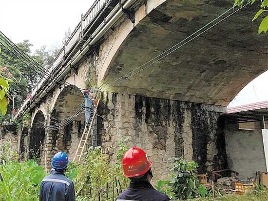 14日,抢修人员对东江大桥附近线路进行检查 徐猛 摄