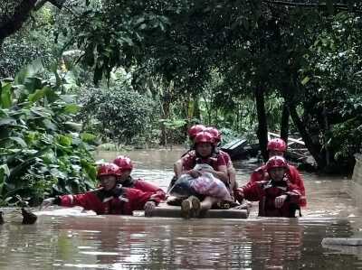 6月16日,因遭遇暴雨袭击,广西沿海多处发生严重内涝,居民被困。当地消防部门接到求助信息后,先后转移被困的居民数十人。图为利用铲车运送被困居民。