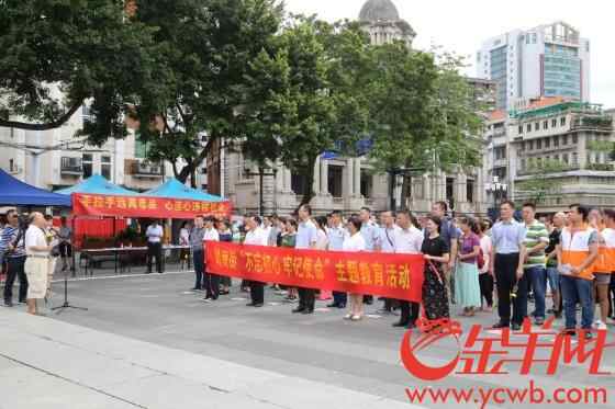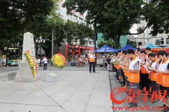 活动在庄严的国歌声中开始,全体人员面对着纪念碑肃立,沙基惨案亲历者后人方先生慷慨激昂地为大家讲述了当时的历史事件,展现了革命斗争的惨烈和革命烈士为了国家民族视死如归的英雄气概。随后全体人员瞻仰烈士纪念碑并敬献花圈及鲜花,向先烈致以崇高的敬意。活动现场,岭南地区禁毒宣传队还发起了“禁毒从我做起”的倡议,来自平安促进会物流寄递企业的代表进行禁毒集体宣誓。