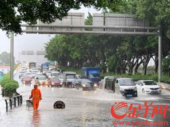 当天14时许,记者自现场看到,广园快速路东往西方向汇景新城路段,右侧的多条车道已积满雨水,车辆无法通过。有抢险人员进入深水区,找到地面的沙井盖并打开,尝试排走积水。此时,广园快速路汇景路段东往西的车流,已经堵到科韵路去了。