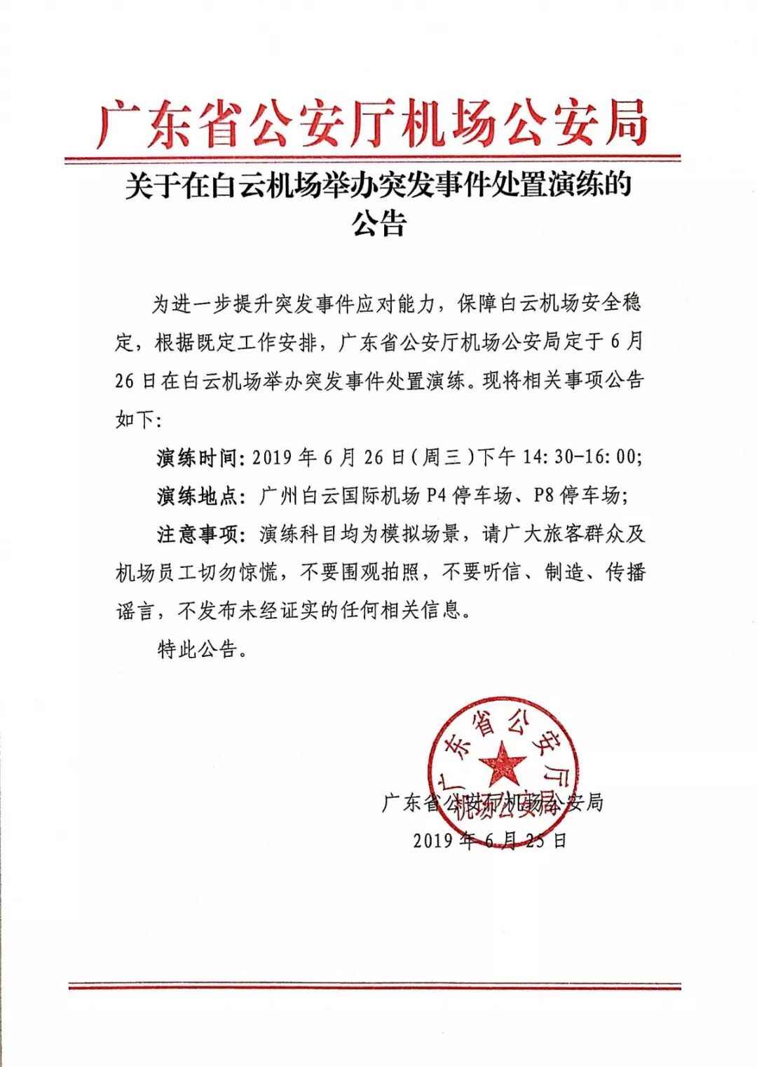 为进一步提升突发事件应对能力,保障白云机场安全稳定,根据既定工作安排,广东省公安厅机场公安局定于6月26日在白云机场举办突发事件处置演练。现将相关事项公告如下: