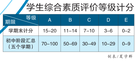 根据每学期末计分情况得出评价结果,初中学段结束时,将5个学期学生综合素质评价五方面内容得分分别汇总,分A、B、C、D、E五个等级,汇总后的得分作为学生初中毕业综合素质评价各方面总得分。
