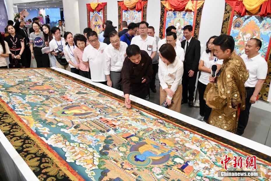 6月30日,为庆祝国庆70周年、香港回归祖国22周年,香港各界庆典委员会在全香港举行多个大型庆祝活动,其中“青海唐卡绘画艺术精品展”于香港中央图书馆举行开幕典礼,与全香港市民一同庆祝国家与香港的盛事。现场展示70多幅唐卡精品、藏族特色文化产品等,并有国家级非遗传承人现场制作唐卡,藏绣、银铜器,藏族黑陶等。图为入场人士观看展览,观赏大幅唐卡艺术品。中新社记者 李志华 摄
